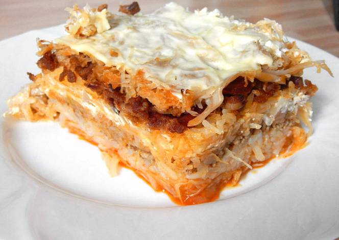 A káposztát felszeleteljük, egy edénybe tesszük és felöntjük annyi vízzel, ami ellepi, sózzuk, puhára főzzük, majd leszűrjük. Egy másik edényben a szokásos módon, sós vízben megfőzzük a rizst. A szalonnát felszeleteljük és sütni kezdjük, hozzáadjuk a felaprított hagymát is, amikor megdinszteltük a darált húst is belekeverjük és fűszerezzük. Puhára pároljuk, ha szükséges egy kevés vizet önthetünk alá. Kizsírozott, hőálló edénybe rétegezzük a káposztát, majd a rizst és a húst. A tetejét befedjük káposztával, a rizstejfölt elkenjük rajta. 160 fokos sütőben 30 percen át sütjük, majd hagyjuk egy kicsit hűlni és szeletelhetjük.